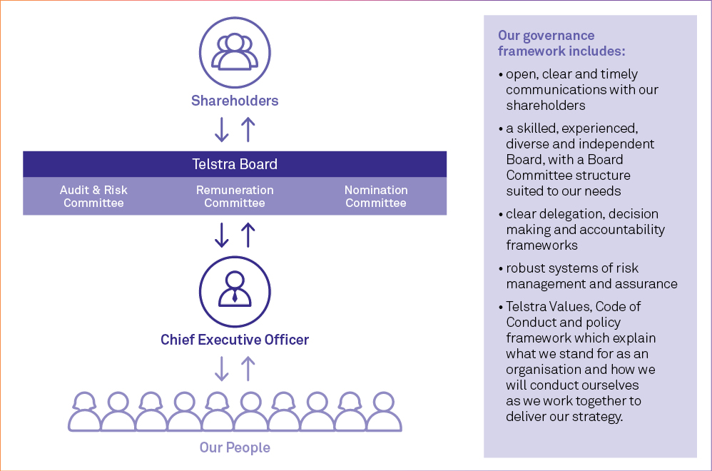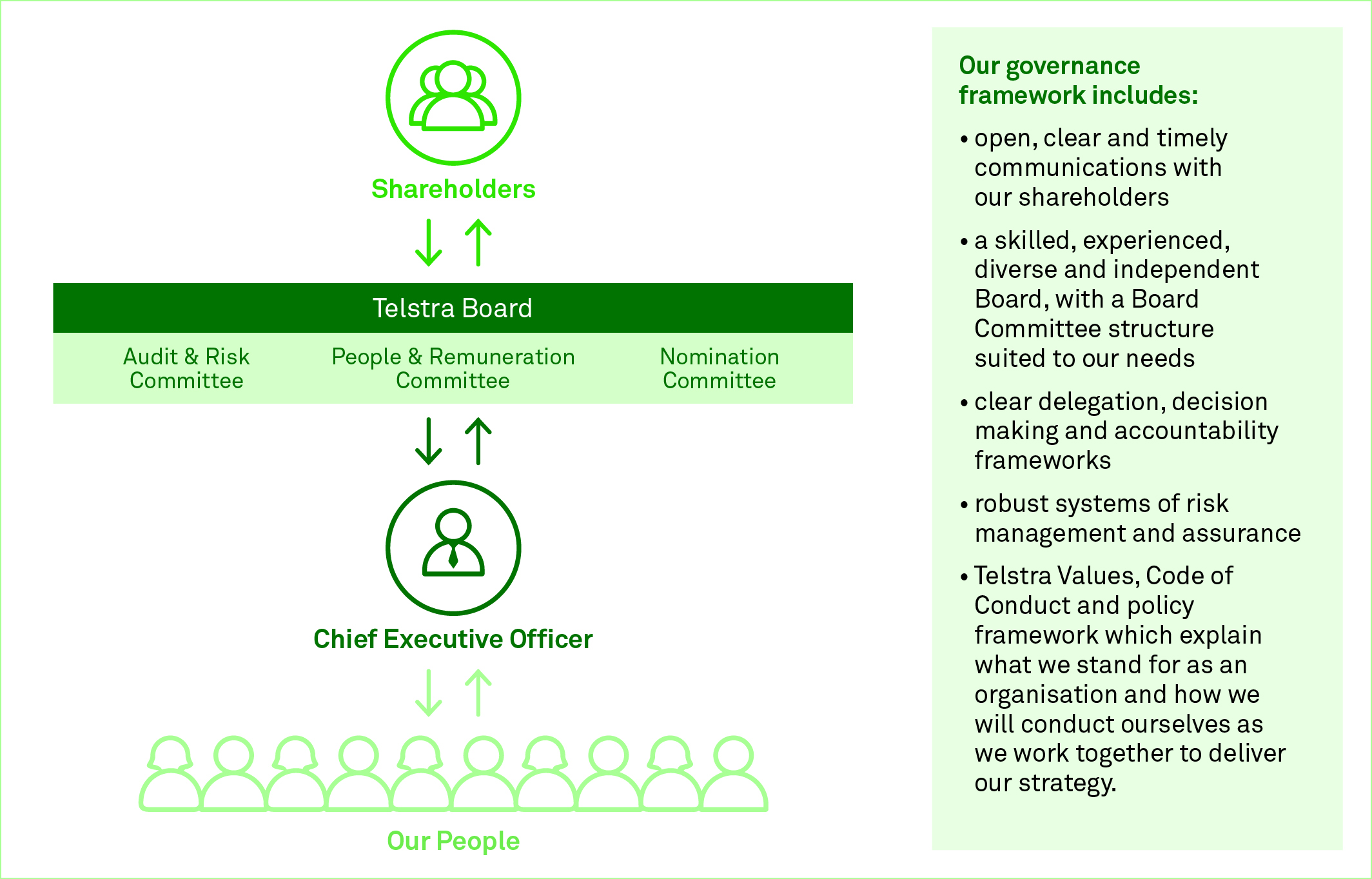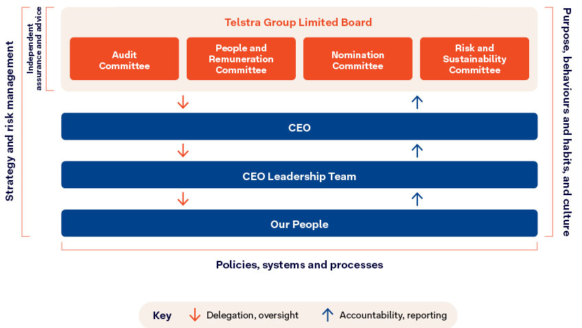 Telstra complies with the ASX Corporate Governance Council’s fourth edition principles and recommendations and regularly reviews its practices to align with current and emerging developments, market expectations, and regulatory changes. Refer below for our latest Corporate Governance Statement (and Appendix 4G) and other key Governance documents policies.