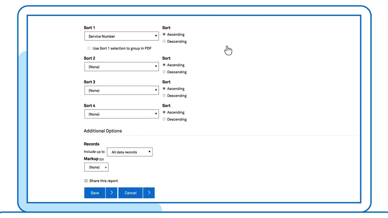 Under Additional options, you can add a markup or, in a detail report, restrict the number of records. You can share the report with others in your organisation by ticking this box. Select Save.