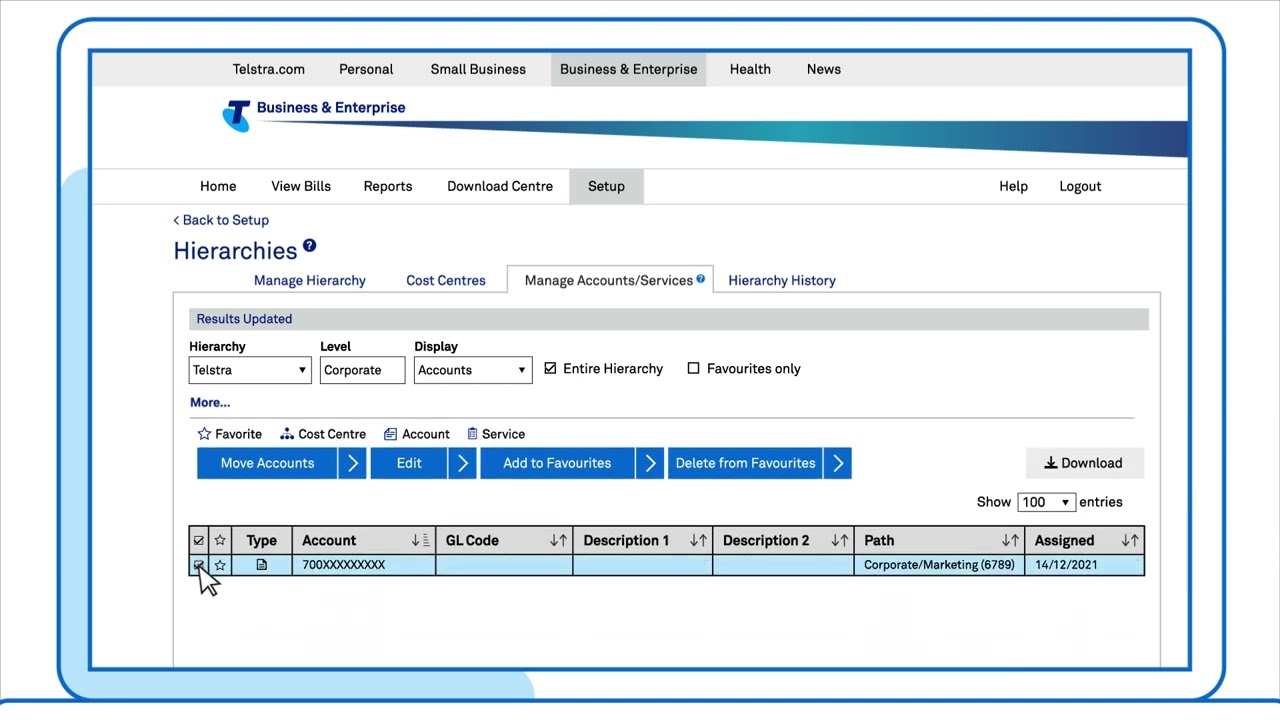 In Account information, you can choose to hide or unhide accounts which will apply across all your billing and reports, to declutter your view.