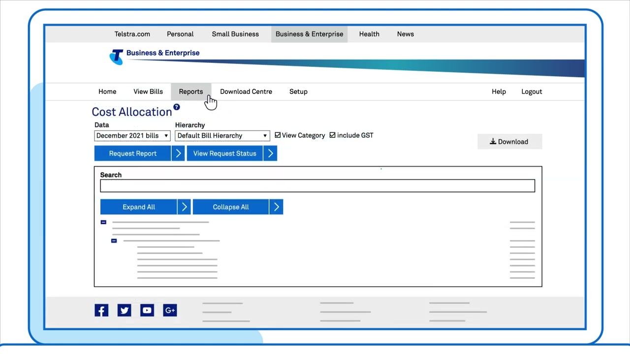 Underneath that you’ll find quick links to common activities: latest invoices, customised reports, allocate services and a quick link to Telstra Connect.