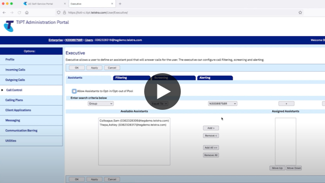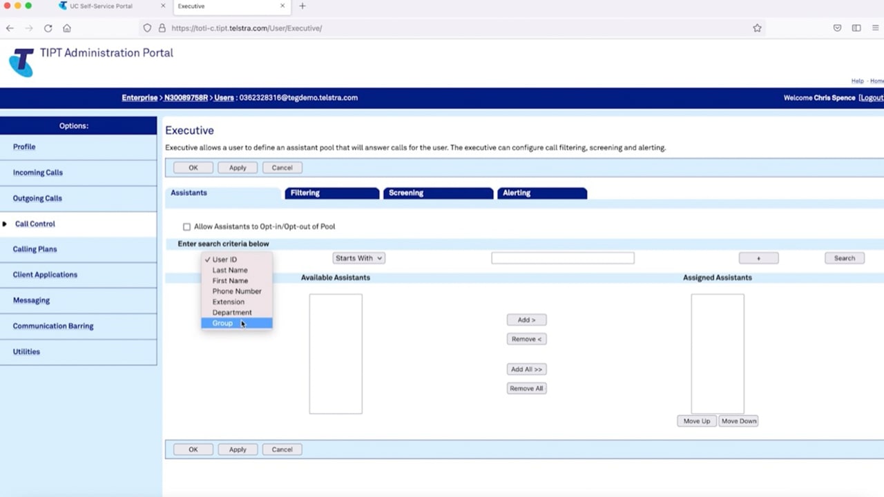CHRIS: So, in the TIPT administration portal, we start in Raph the exec’s profile, we go to the call control option in the menu and then choose executive. And in there what we need to do is to identify who our executive assistants are going to be so we can do a search on user ID.