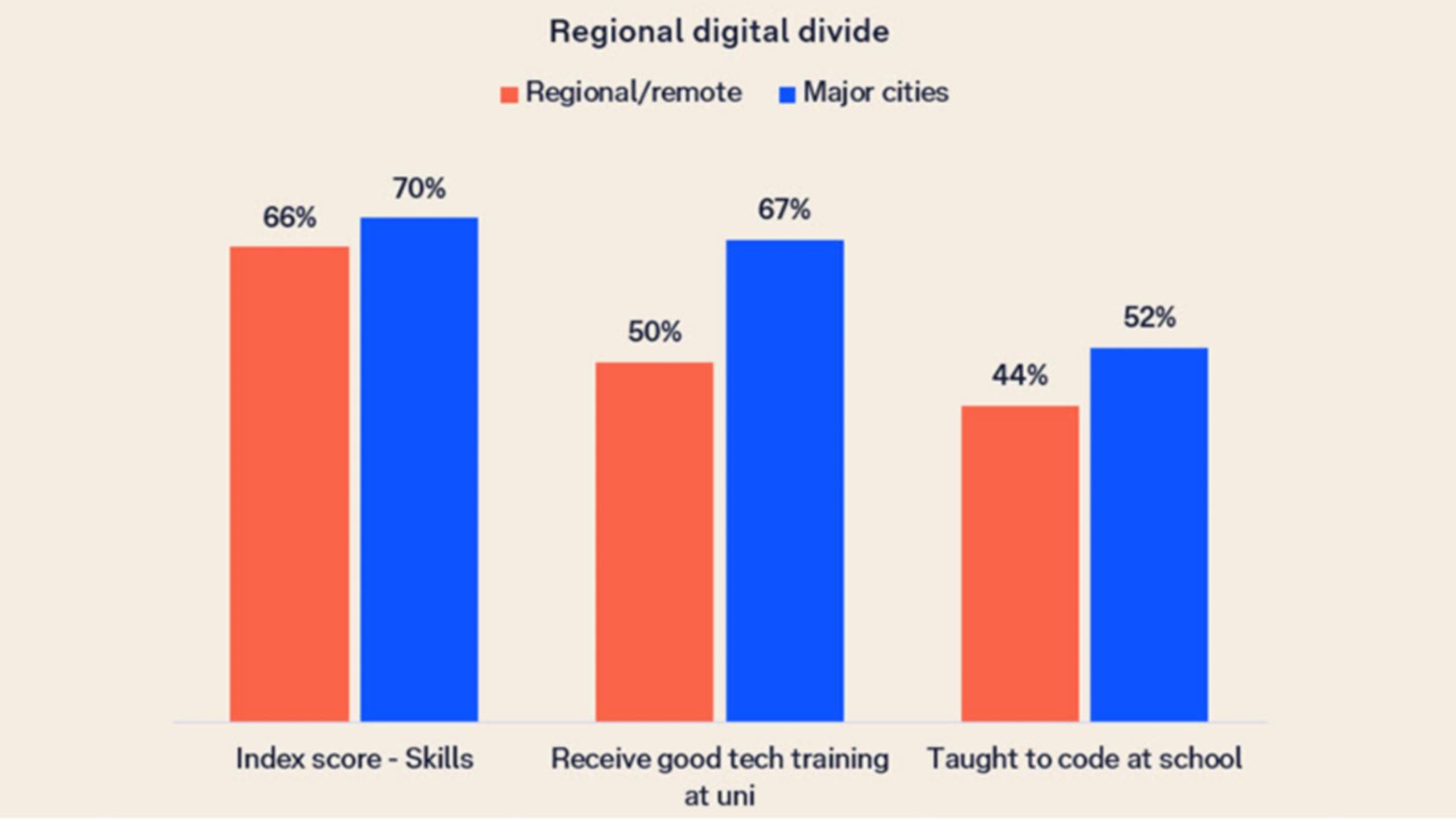 In addition, young people from regional/remote areas in Australia (50%) are less likely than young people from major cities (67%) to agree that they receive good training at university to use technology, or to have been taught how to code at school (major cities: 52%, regional/remote: 44%).