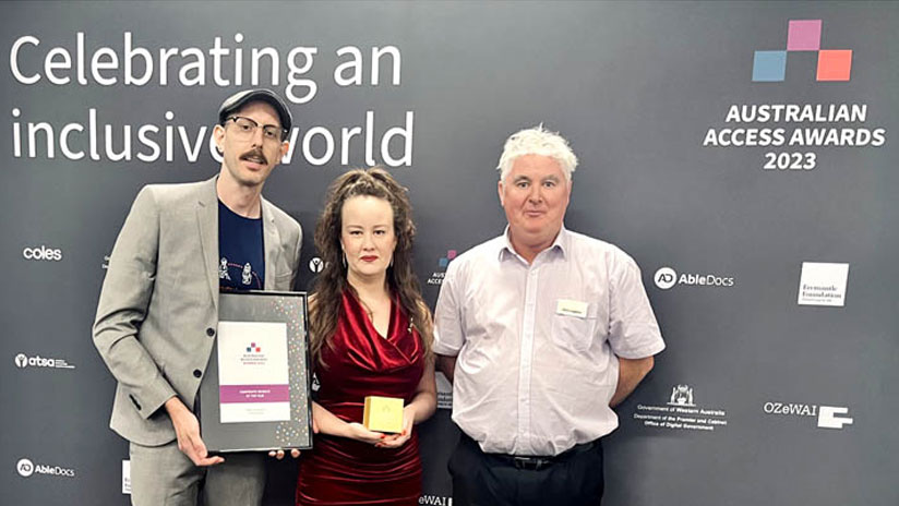 L-R: Karl McCabe, Simonette Carter and Chris Leighton proudly show off our Accessibility Award and nomination at the Australian Access Awards on 22 November 2023.