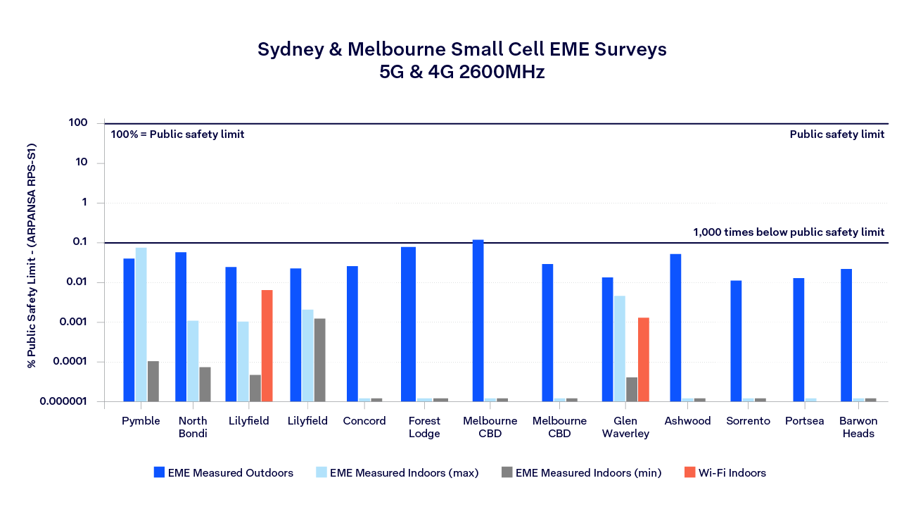 Our testing results show the EME levels in the general environment from the 5G small cells to be very low less than 1% of the EME safety limits and ranged from 0.28 to 0.0005 % of the public safety limit. In most cases the 5G small cells produced EME levels over 1000 times lower than the public safety limit even under high activity.