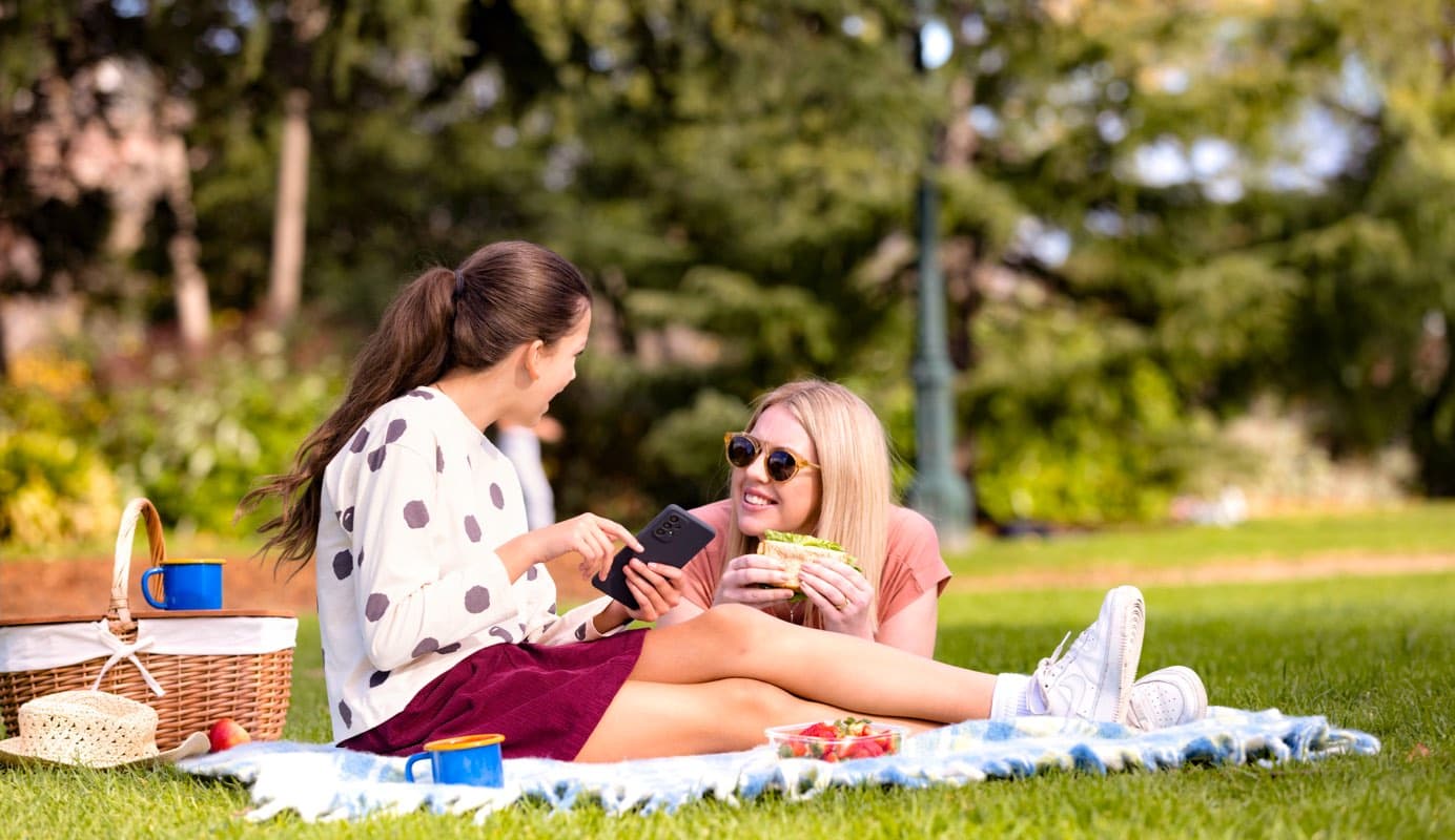 Two smiling adults enjoy a picnic and one is holding a mobile phone.