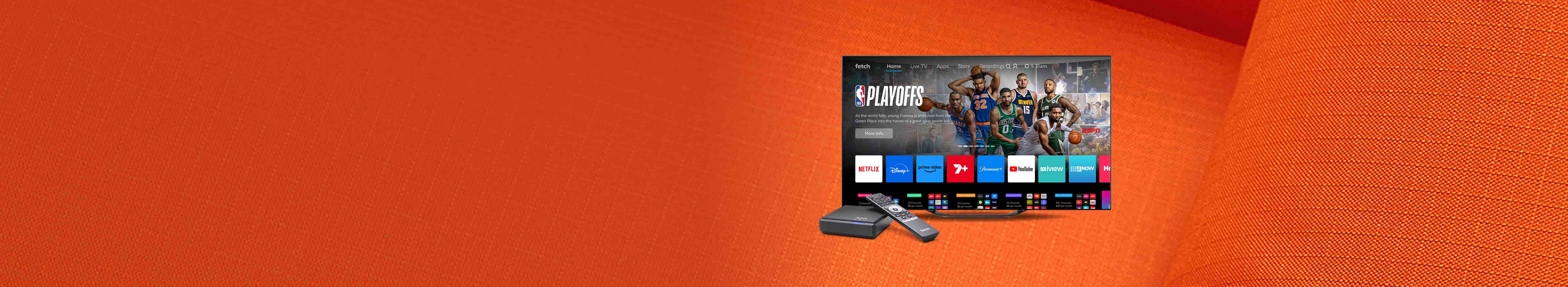 Watch, stream, play, and discover your favourite entertainment with Fetch, your ultimate home entertainment hub. Enjoy instant access to free entertainment, with over 30 channels and interactive games ready to play from day one. Plus, get seamless access to live TV, streaming apps, premium channels, and interactive games, all in one place.