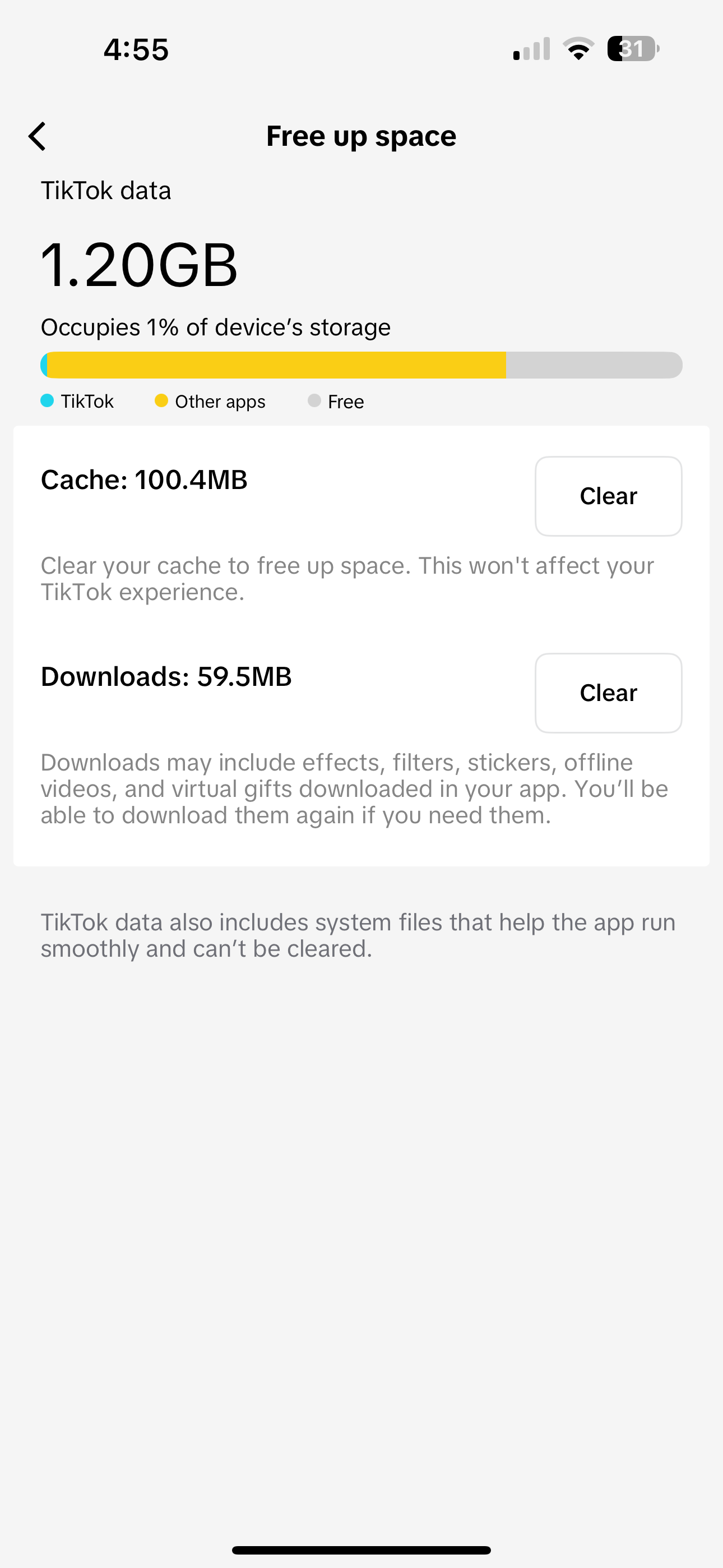 - Tap "Free up space" and hit "Clear" next to "Cache." Voila, a clean slate!