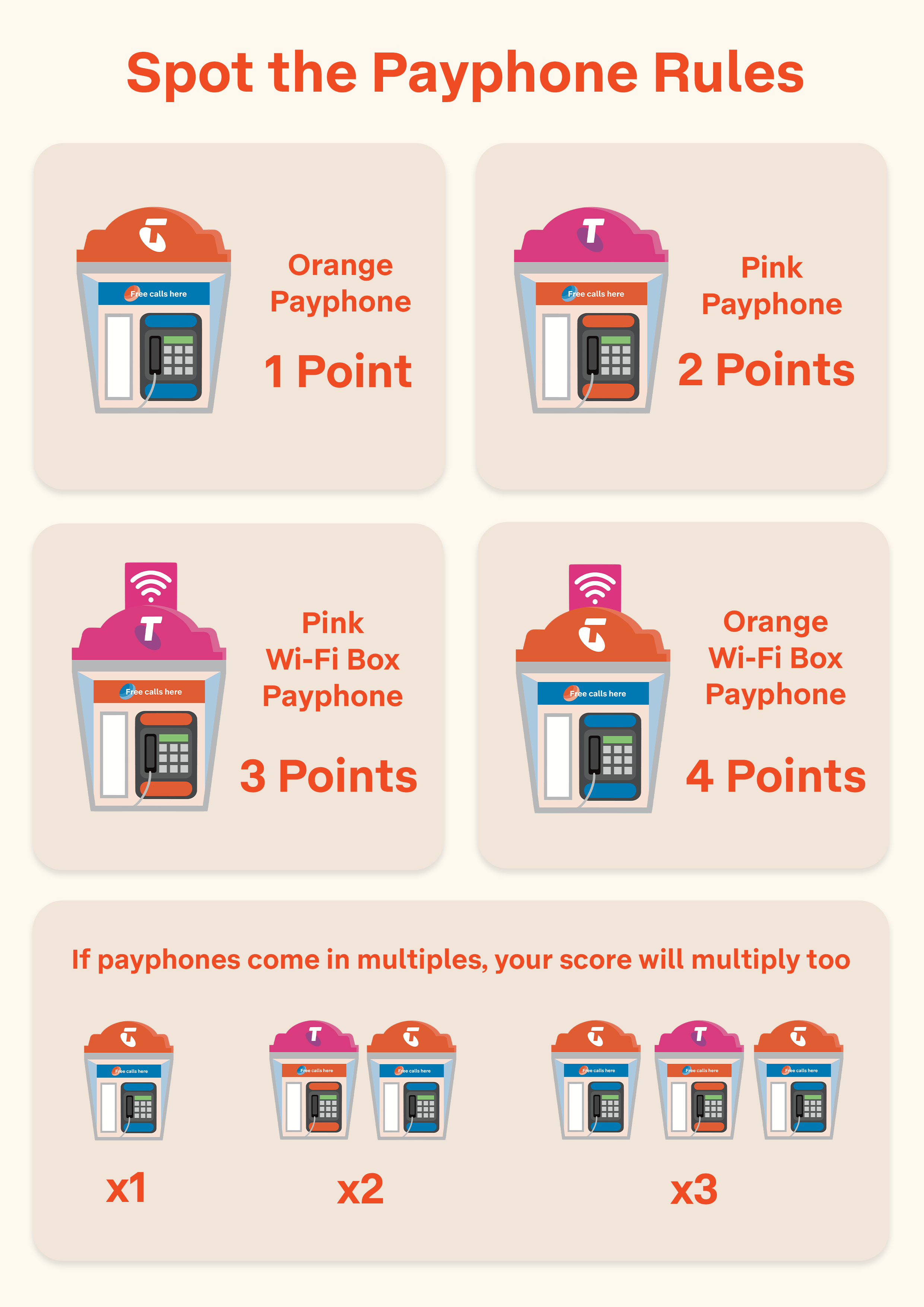 With over 14,000 payphones spread across the country, all with different colours, features and configurations it makes a great opportunity for a new kind of spotto. It's called Spot the Payphone and we've made a handy chart with the rules you can download below to print out or save on a tablet for the road. Each colour payphone awards different points and if you spot multiple payphones together in a row your points are multiplied.