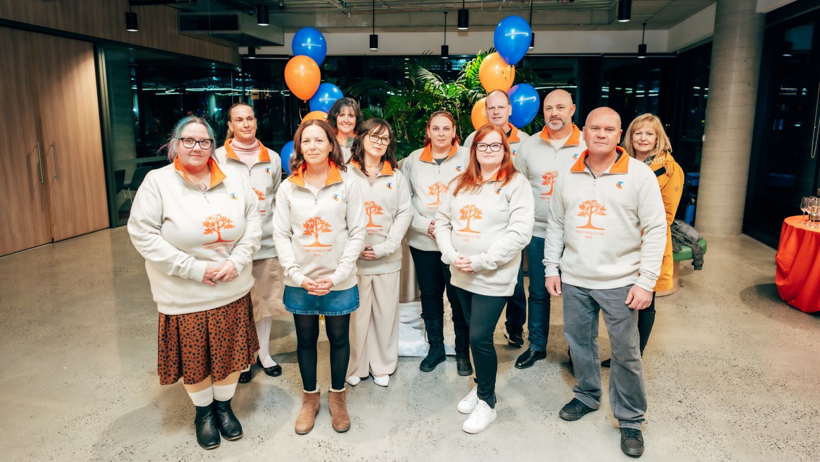 A few weeks ago, in preparation for the time capsule opening, the ten original participants were reunited at Telstra’s Adelaide office to reminisce about the original day and to recreate the iconic group photo from 1985. Joining them was Jill Mitchell, a former Telecom staffer who also featured in the original photo.