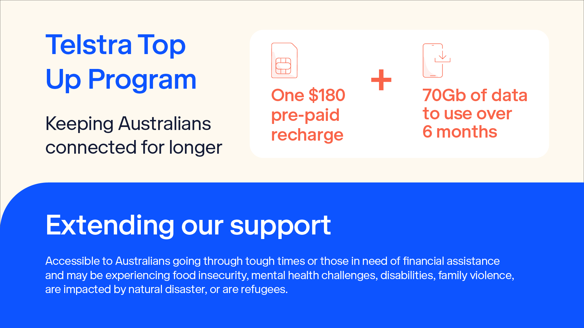 Our recently improved Pre-Paid Top Up program offers six months of essential phone, SMS, and data services to even more Australians facing financial challenges. It's just one of the ways we're increasing our affordability support for those who need it.