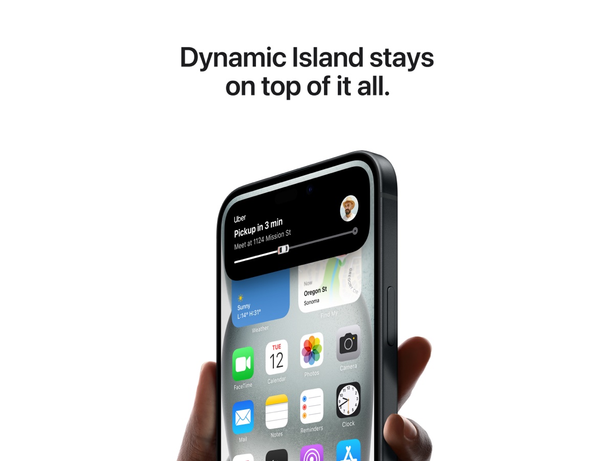 iPhone 15 held in hand, Dynamic Island showing ride share tracking information.