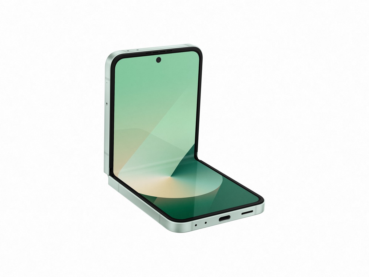 Rear view of the Galaxy Flip6, half open, showing rear camera and exterior screen.