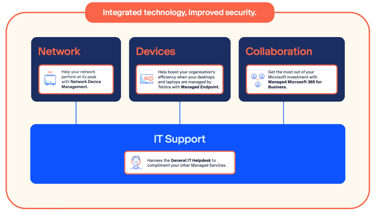 Telstra’s General IT Helpdesk service is designed to remotely provide you with a level of general and reactive technical support and assistance across your agreed IT environment for a specific number of monthly Support Hours (depending on your selected plan) on a ‘best effort’ basis. In the context of Managed Services, General IT Helpdesk functions as an ‘add-on' to your existing Managed Service and is a month-to-month service.