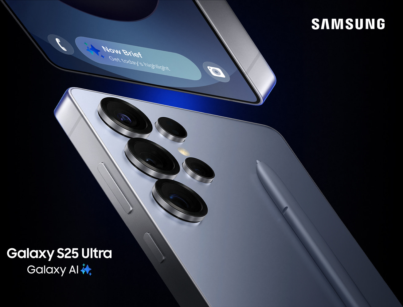 Samsung Galaxy S25 Ultra rear view in Titanium Silver Blue colour with S Pen.