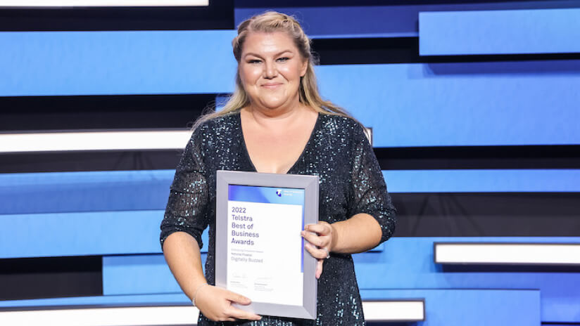 Image: Founder and director of Digitally Buzzed, Bel Cook, holding her 2022 Telstra Best of Business Award.