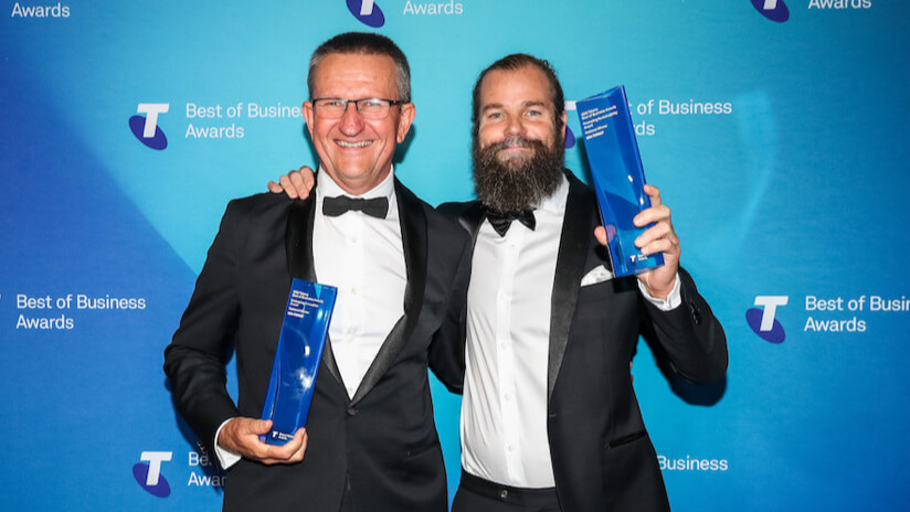 Image: Sea Forest chief scientist Dr Rocky de Nys (Left), and Co-founder and CEO Sam Elsom (Right) at the Telstra Best of Business Awards.